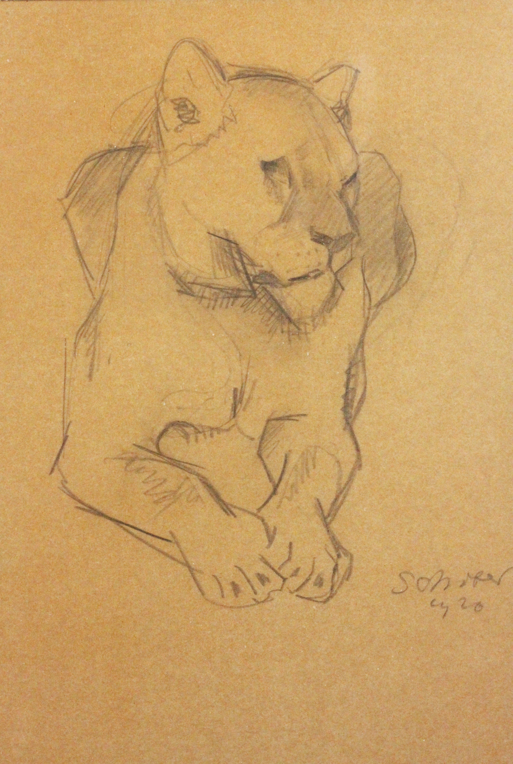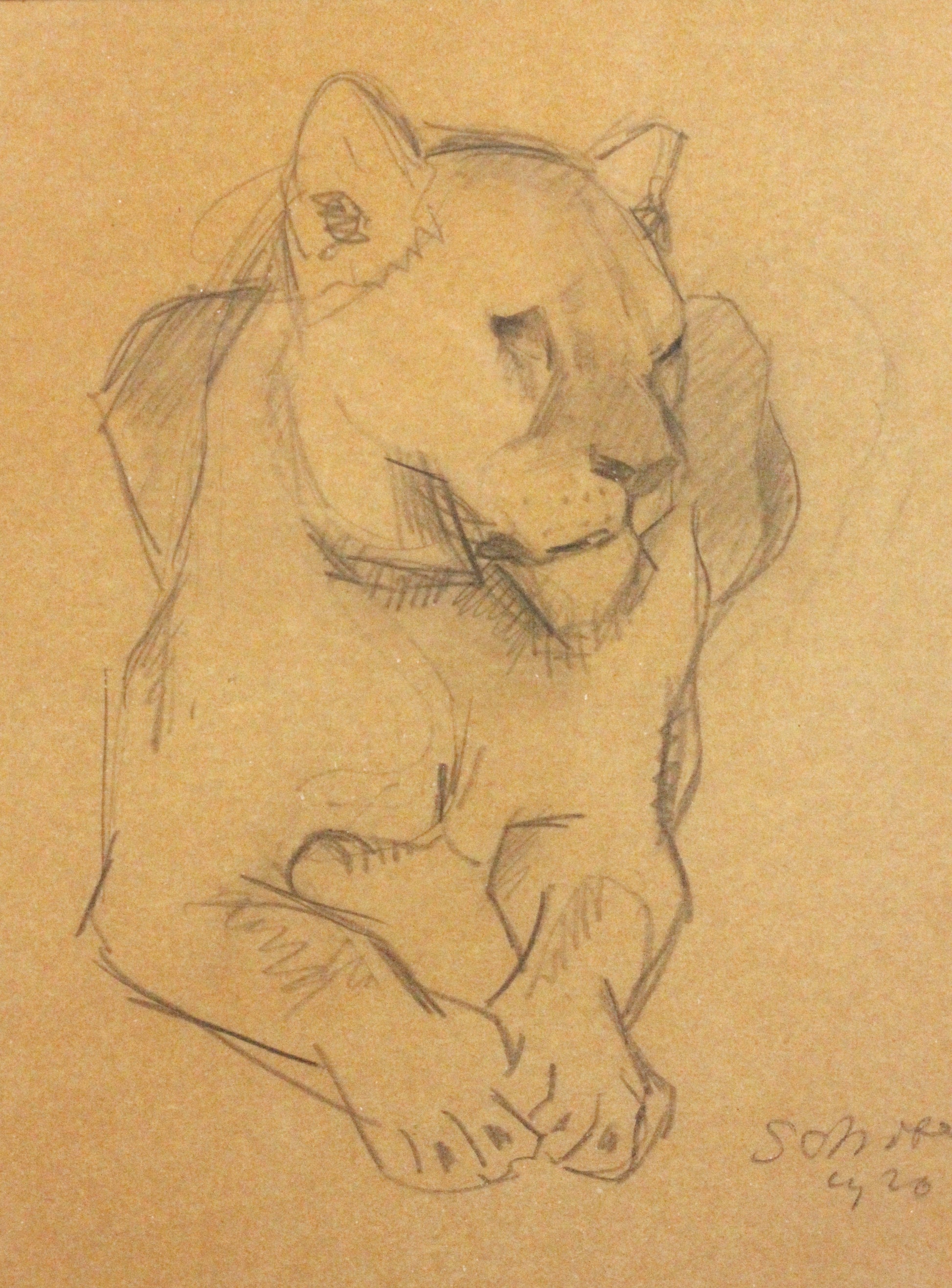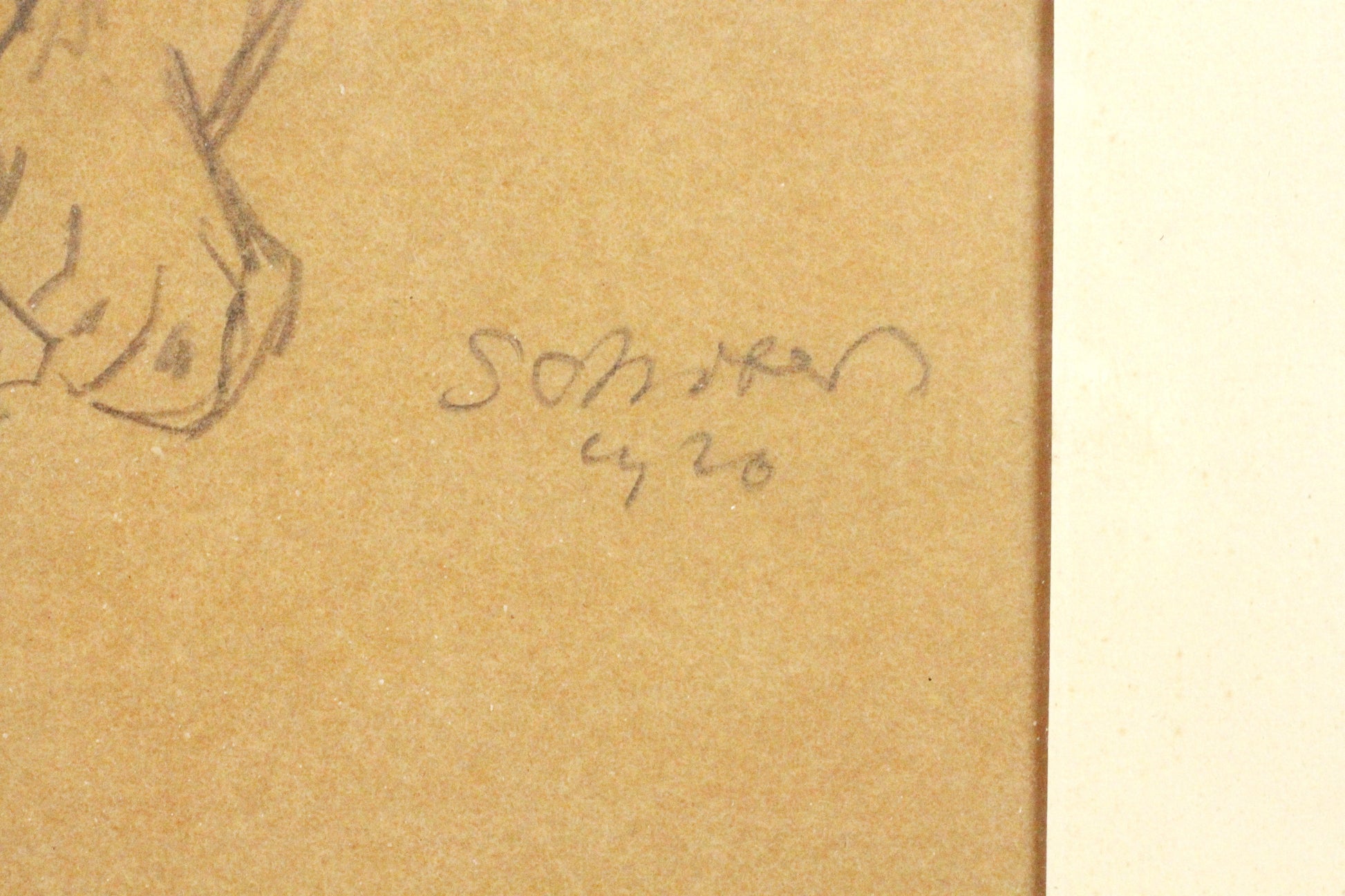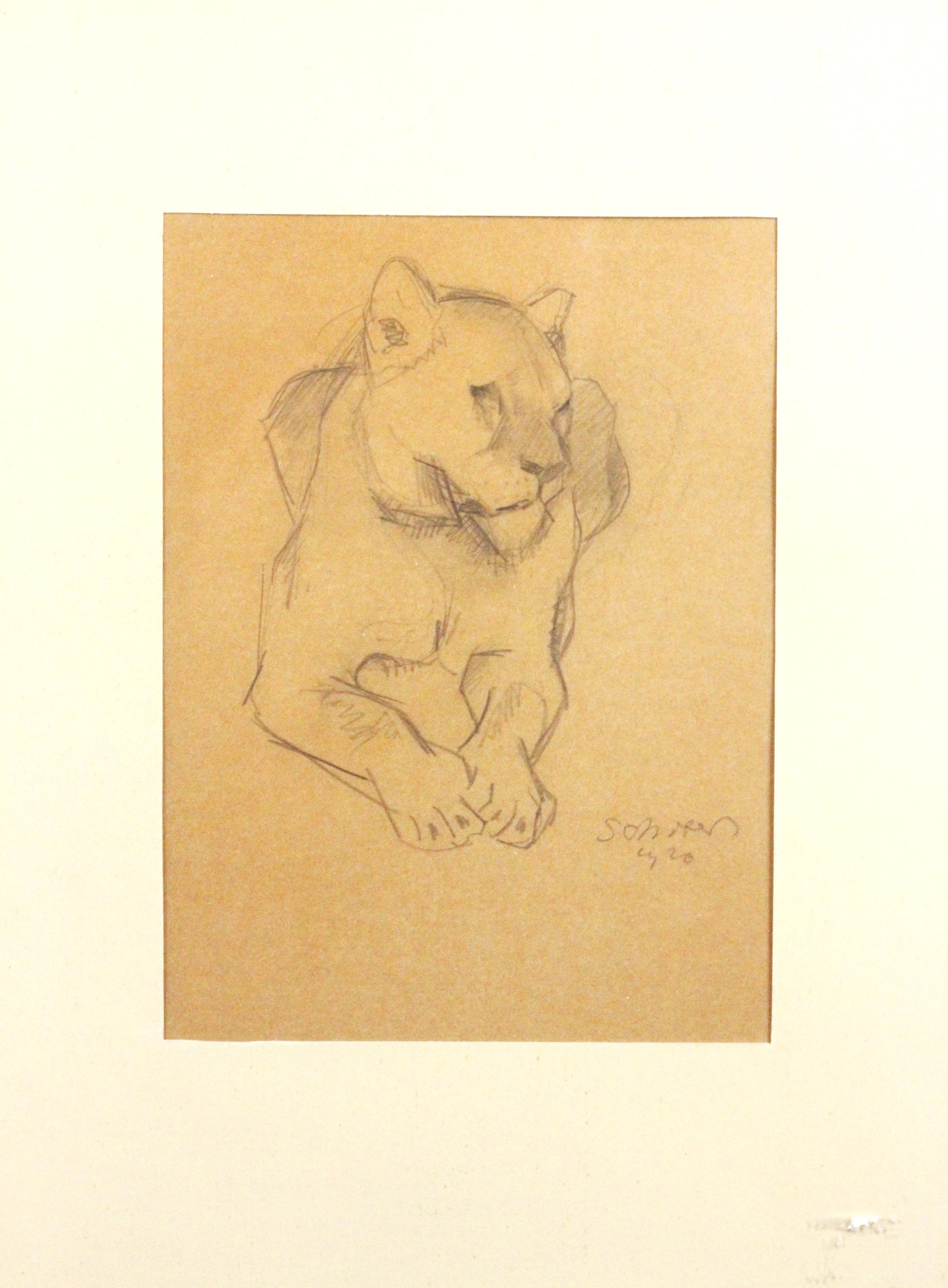 Bleistiftzeichnung, signiert Peter Jakob Schober (1897-1983). Hinter Glas gerahmt. Rahmen ausgebrochen, auf dem Rahmenglas Reste eines Aufklebers. Zeichnung selbst in sehr gutem Zustand. Unleserlich datiert (1920?)