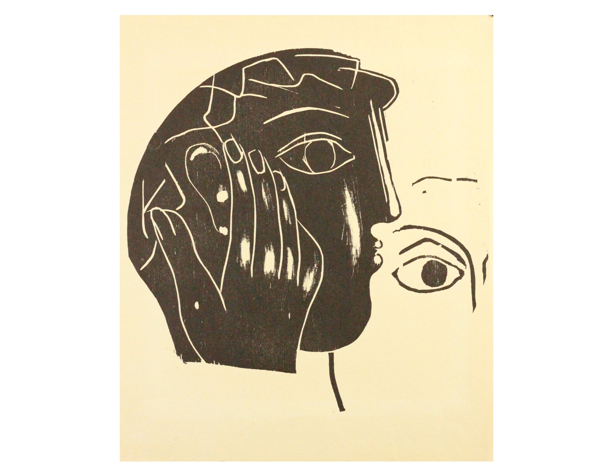 Unsignierter Holzschnitt von Walter Wörn (1901-1963). Rückseitig beschrieben. Titel: Profil-Kopf mit Hand. Datiert 1952. Auflage 5/22.